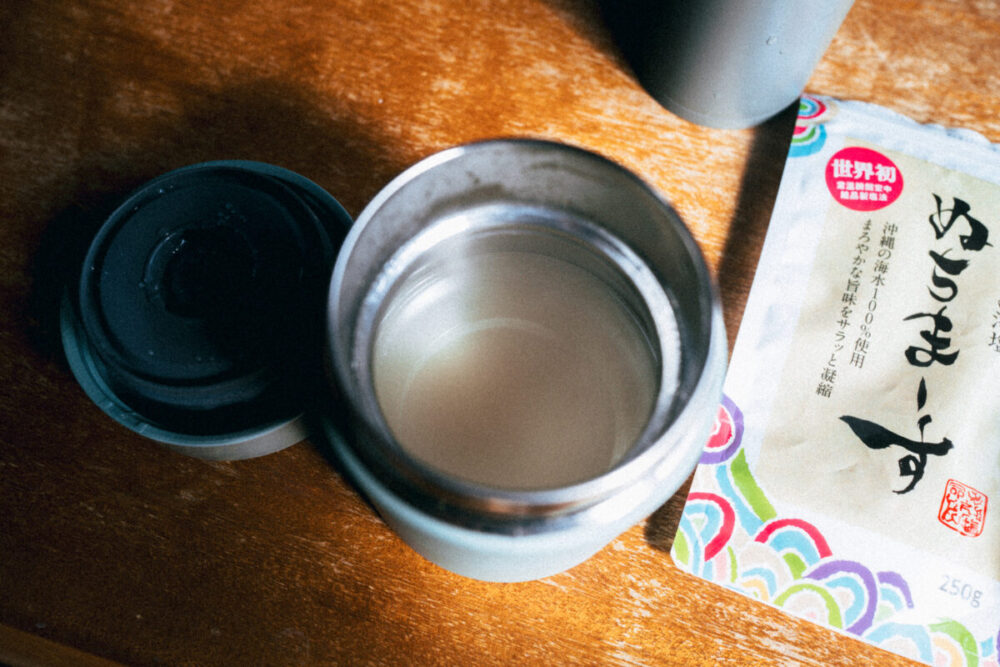 こちらは粉末のボーンブロスをミネラルたっぷりのぬちまーすを入れてスープにし、スープジャーで楽しんでいます。